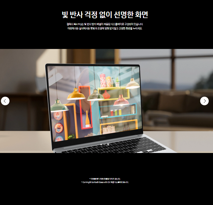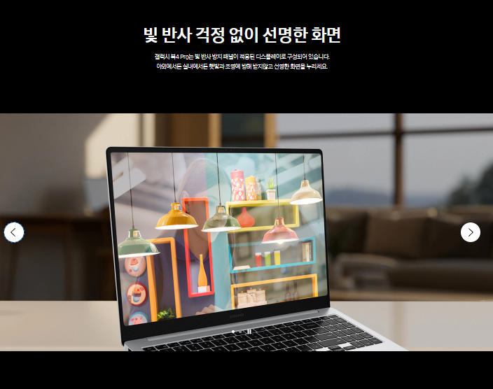 -ANTI-Reflection:전작에서 문제점중 하나로 꼽혔던중 하나가 바로 빛반사 였는데요 이번 갤럭시 북 4프로에서는 빛반사를 방지하기위해 새로운 패널을 적용해 빛 반사 문제를 해결하고 보다 선명한 화면을 보여줍니다.