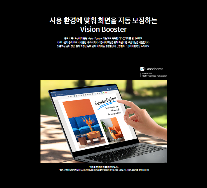 -vison booster: 갤럭시 북 4 프로에 vison booster 기능을 적용하면서 카페나 벤치등 야외에서 사용할때 최적으 ㅣ디스플레이 구현을 위해 자동 보정기능을 지원합니다.