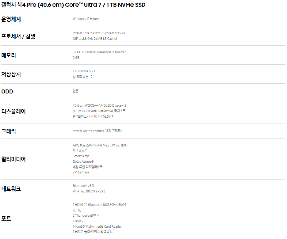 디스플레이:40.6cm WQXHA+AMOLED Display(2880x1800),Anti-Reflective,터치스크린 16인치